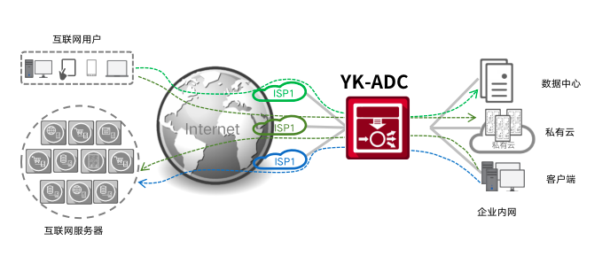 云科通明湖应用交付控制器提供链路负载均衡技术(LLB)和全局负载均衡技术(GSLB)分别实现出向流量(Outbound)和入向流量(Inbound)的统一管理。